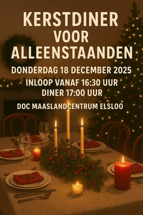 Werkgroep DOC - Dorpsplatform Elsloo organiseert ook dit jaar weer een sfeervol Kerstdiner speciaal voor Alleenstaanden. Geniet van een heerlijk verzorgd diner in een feestelijke kerstsfeer, waar ontmoeting en gezelligheid centraal staan.
