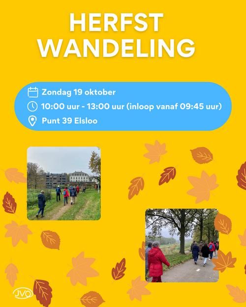 Op zondag 19 oktober van 10-13 uur organiseert Stichting Jongeren Voor Ouderen hun jaarlijkse herfstwandeling 🍂😊 Eerst is er een mooie wandeling, en achteraf een lekkere en gezellige lunch!